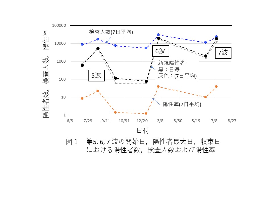東京都のCOVID-19感染症流行の第6, 7 波について詳しい数理解析していませんが,これまでの理論的立場から概要について述べます.東京都における第5波,第6波の拡大開始日,最大陽性者数の日,および収束日における陽性者数と検査人数,陽性率(過去7日平均)を比較的に図1に示します.また第7波の拡大開始日と7/16日現在のそれらの値も示しました.これから以下のことが分かります.